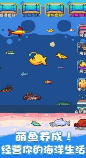 《快来养鱼免广告版》是一款画面温馨、模拟真实场景的休闲游戏。在这款游戏中,玩家将拥有一座庞大而美丽的水族馆,可以收集和培养各种各样的鱼类,同时还可以通过出售门票吸引游客前来参观,打造出一个充满海洋氛围的乐园。游戏的核心玩法是养鱼和经营水族馆。玩家需要收集各种鱼类,并给予它们适宜的生活环境。这些鱼类包括热带鱼、鲨鱼、海马等多种海洋生物,每种鱼类都有其独特的习性和需求。玩家需要了解这些信息,才能让鱼类健康成长。