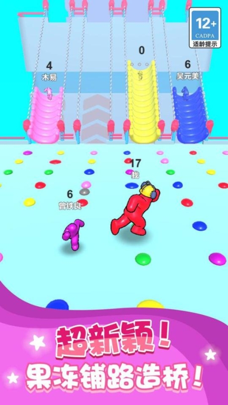 3、通过捡取色块增加储量,搭桥通关,控制彩色果冻人展开狂欢冒险。