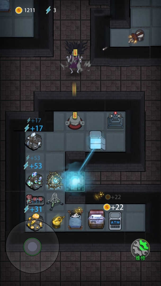 2、若撸门的两个AI宿舍都没有炮塔,则游戏难度提高,在鬼每一次来袭时请停止发育,全力叠炮塔打逃跑。