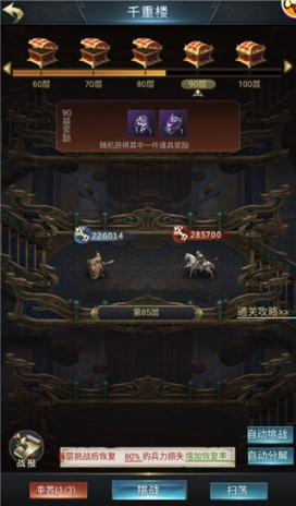 玩家战胜每层的重楼守卫都能获得一定的奖励,同时获得下一层的挑战资格。挑战的层数越高,守卫就越强大,奖励也会更加丰厚。通关指定层数,还有机会获得稀有武将装备与道具哦