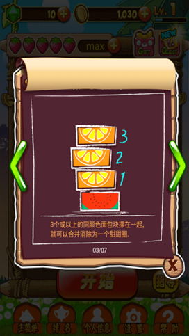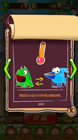 左右下侧展示动物的满意度,玩家需迅速消除与动物颜色匹配的水果以提升其满意度。若动物的满意度达到0%或100%,系统将自动更换不同颜色的动物。特别注意,当动物的满意度为0%时,它们会在被替换前轻啄面包树,使树变得不稳定,务必小心不要让树倒下。