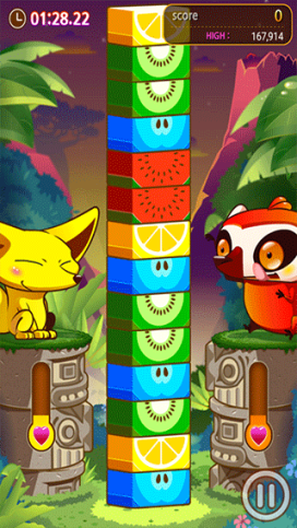 这是一款创新的消除游戏,不同于传统消除游戏,它以几种不同颜色的动物伙伴为主题。游戏中有许多水果,这些小动物只喜欢吃与自己颜色相同的水果。游戏考验的是玩家的反应速度和技巧。玩家只需将水果左右滑动,当小动物吃到与自己颜色匹配的水果时,它们的满意度会提高,从而保持愉快的心情,不会去攻击猴面包树。但如果吃到了不喜欢的水果,小动物们就会生气。水果呈垂直排列,玩家在移动时要确保水果不掉落,并且要在限定时间内尽可能多地从猴面包树上摘取食物喂给两侧饥饿的小动物。尽管玩法简单,但游戏体验独特,而且视觉效果出色。喜欢的玩家还等什么呢?快来下载体验这款独特的消除游戏吧!
